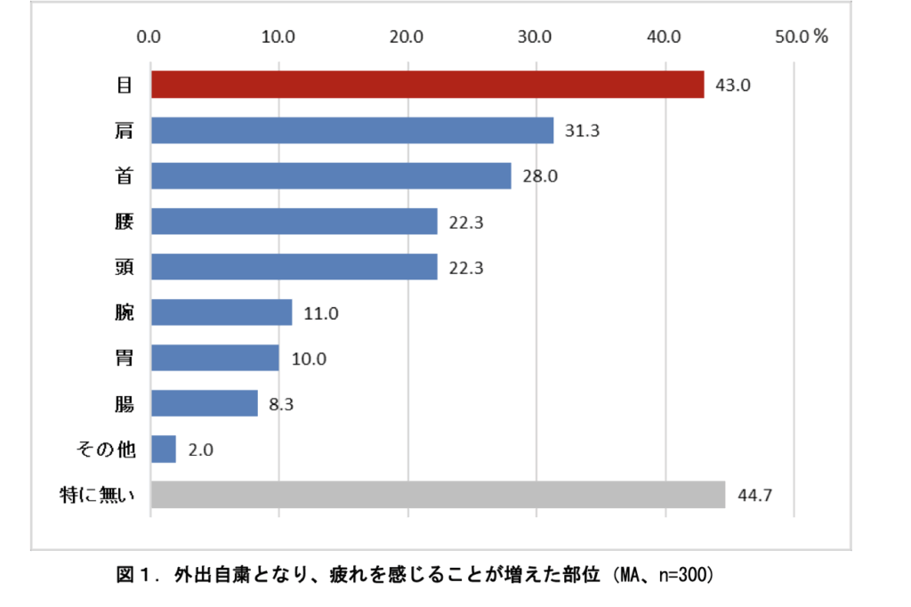 ライオン・外出自粛下の“目の疲れ・不調”に関する実態調査でも紹介されているように、外出自粛中に最も疲れを感じた部位は「目」だったそうです。