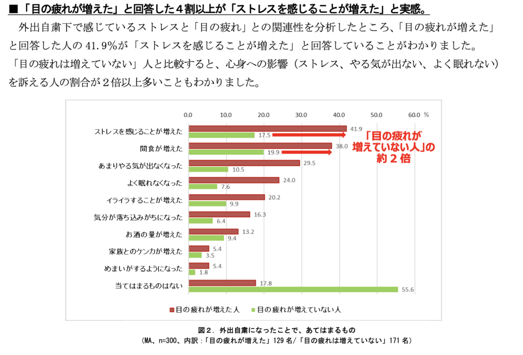 また、目の疲れを感じている人は、ストレスがたまったり、眠れなかったり、イライラしたりと、心や体のバランスにも悪影響が出やすいこともわかっています。