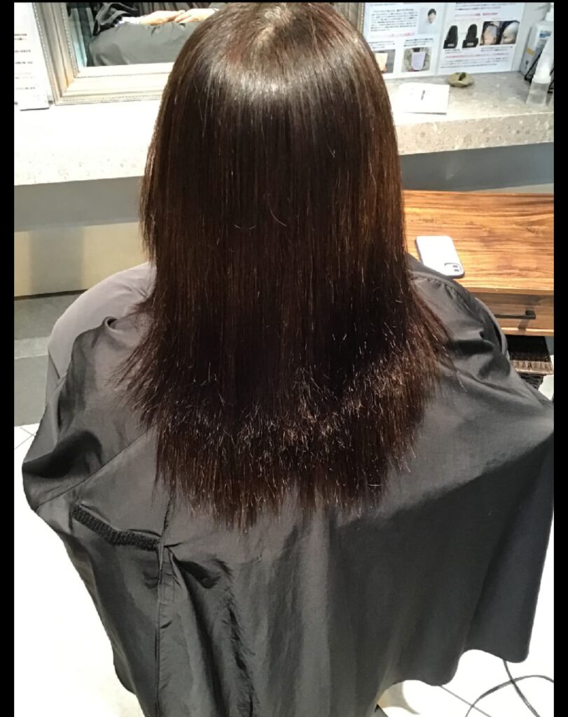 今回ご紹介するお客様は、1ヶ月半に一度のペースでご自身で市販のホームカラーを使用され、さらには時間がない中でご自分で縮毛矯正まで試みてしまった結果、髪が深刻なダメージを負っていました。